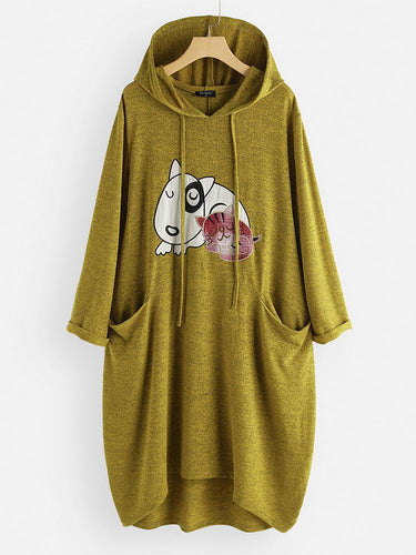• カジュアルな漫画プリント犬ポケット長袖フード付きドレス